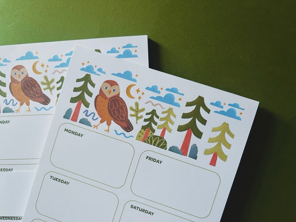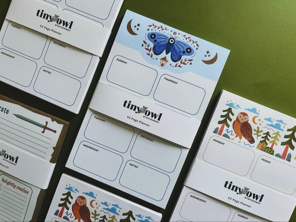 At Tiny Owl Stationery, I illustrate all my designs in procreate or through traditional mixed media methods. My paper products are carefully crafted at my studio from design concept to printing to packaging for their new home!